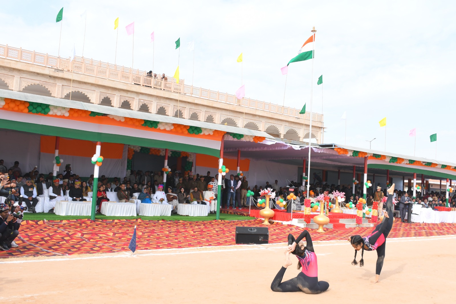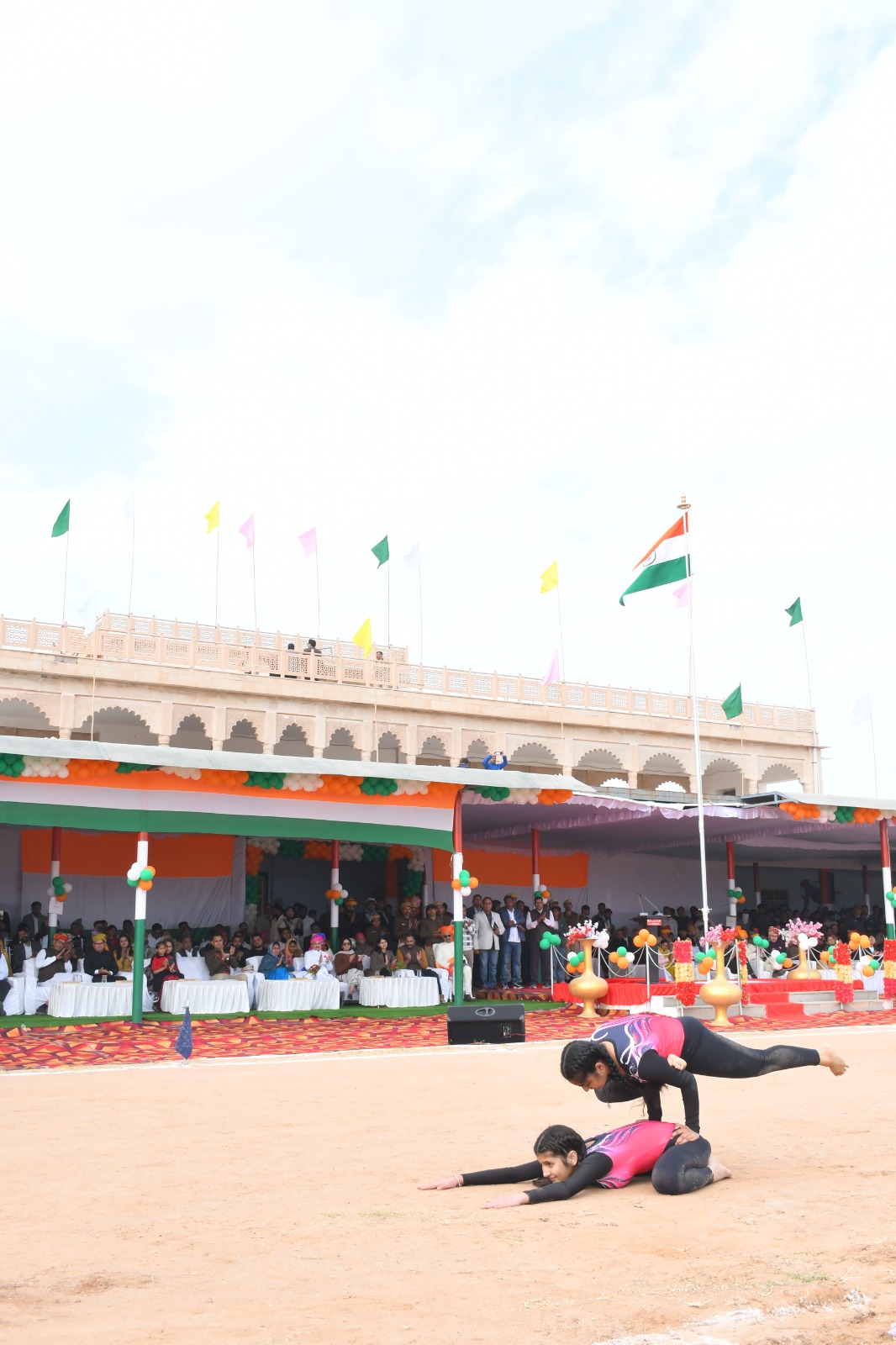 स्कूली छात्र-छात्राओं द्वारा प्रस्तुत सामूहिक व्यायाम एवं देशभक्ति से ओतप्रोत सांस्कृतिक कार्यक्रमों ने समारोह को उल्लासमय बना दिया और दर्शकों में राष्ट्रप्रेम का संचार किया। वहीं गोटन की एल.के. सिंघानिया स्कूल के विद्यार्थियों ने ब्रास बैंड का प्रदर्शन किया। जिसे संपूर्ण वातावरण मधुर धून से गुंज उठा। शारदा बाल स्कूल की छात्राओं द्वारा लेजियम प्रदर्शन किया गया। साथ ही छात्राओं द्वारा योगासन भी किया गया। वही छात्राओं द्वारा लोकगीतों पर आधारित सामूहिक नृत्य की प्रस्तुतियां भी दी गई।