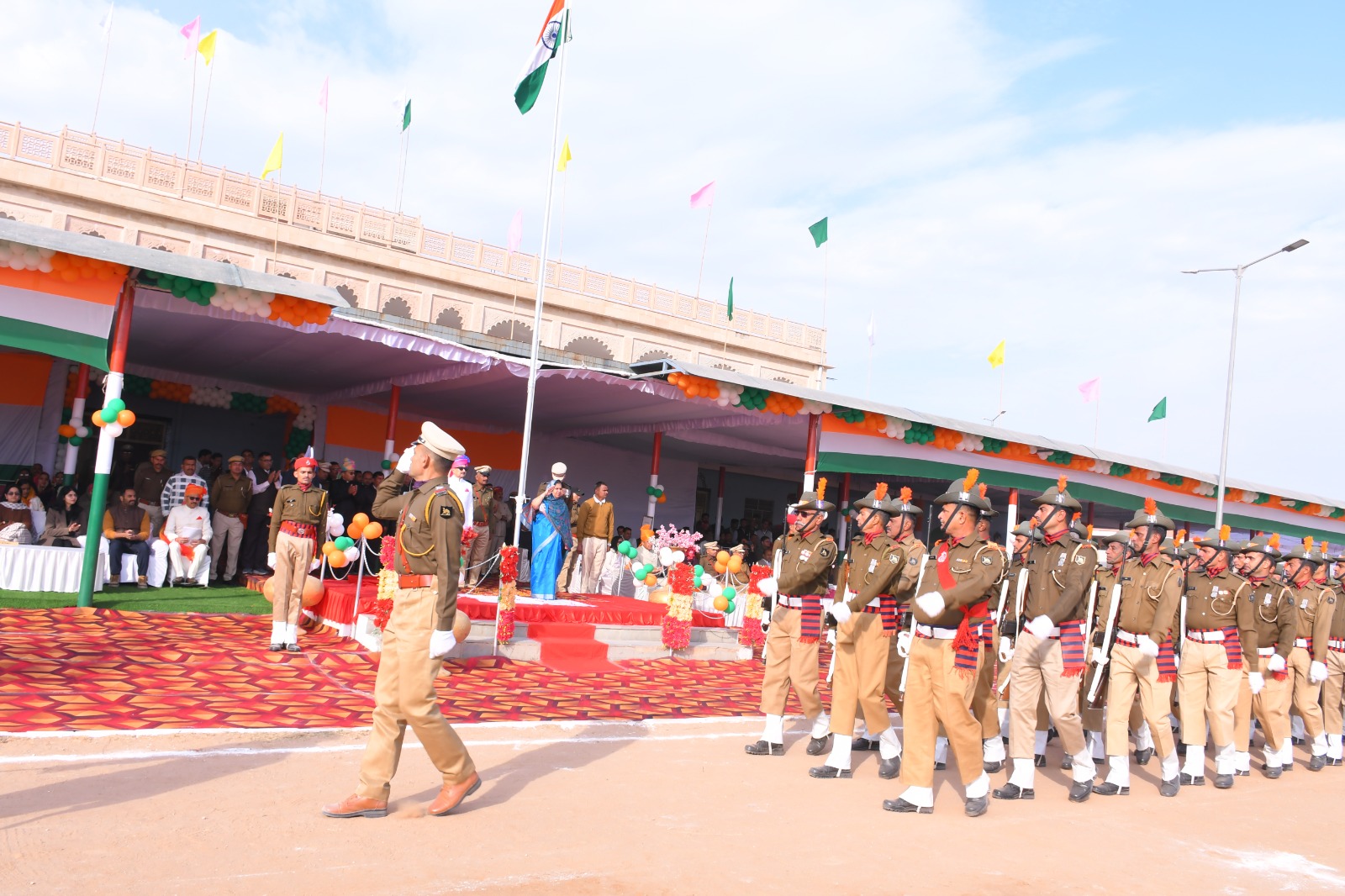 समारोह में प्रथम बटालियन आरएसी, पुलिस विभाग, गृह रक्षा दल, एनसीसी, स्काउट एवं गाइड की टुकड़ियों ने भव्य मार्चपास्ट प्रस्तुत किया।