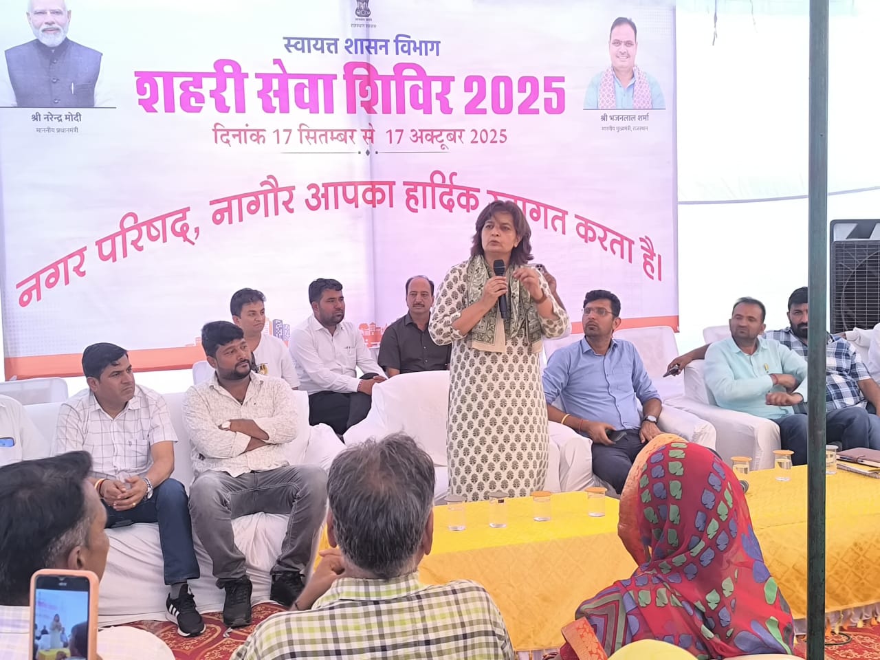 राज्य सरकार के निर्देशानुसार “सेवा शिविर 2025” के तहत नगर परिषद, नागौर में एक विशेष शिविर का आयोजन किया गया। यह शिविर आमजन को सरकारी योजनाओं का लाभ एक ही स्थान पर उपलब्ध कराने के उद्देश्य से आयोजित किया गया। शिविर में विद्युत, राजस्व, चिकित्सा एवं स्वास्थ्य, महिला एवं बाल विकास, श्रम, नगर परिषद, सामाजिक न्याय एवं अधिकारिता विभाग सहित कई विभागों ने भागीदारी की।