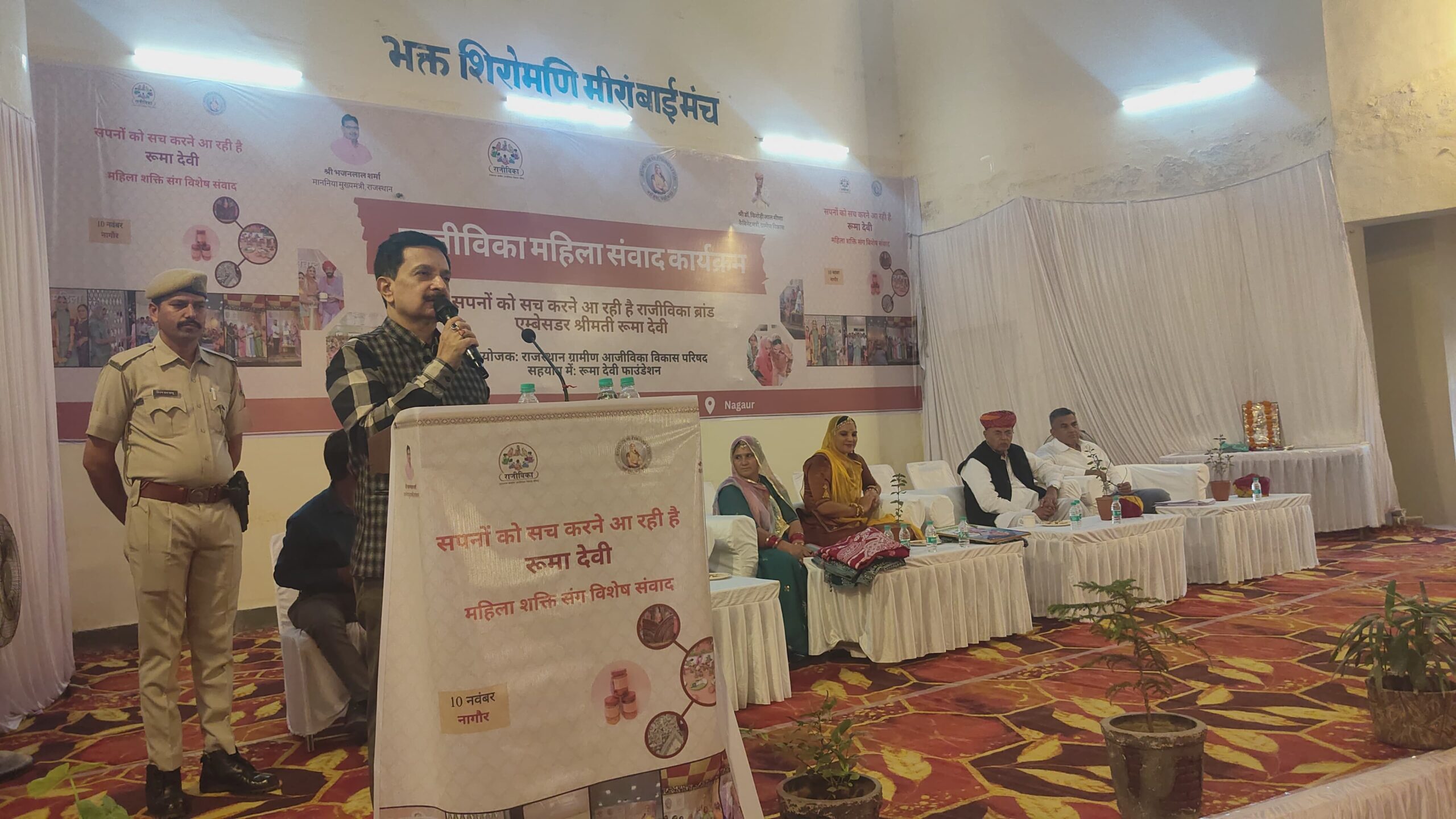 कार्यक्रम में जिला कलेक्टर अरुण कुमार, जिला परिषद सीइओ अरविंद कुमार, जिला प्रमुख भागीरथ चौधरी, डीपीएम नागौर रणजीत चौधरी और राजीविका से नॉन फार्मा परियोजना प्रबंधक भँवर सिंह, परियोजना प्रबंधक देवेंद्र कुमार और यंग प्रोफेशनल प्रणब सिन्हा मौजूद रहे। उन्होंने महिलाओं के कार्यों की सराहना करते हुए कहा कि ऐसे संवाद कार्यक्रम उन्हें नई दिशा और पहचान दिलाते हैं।