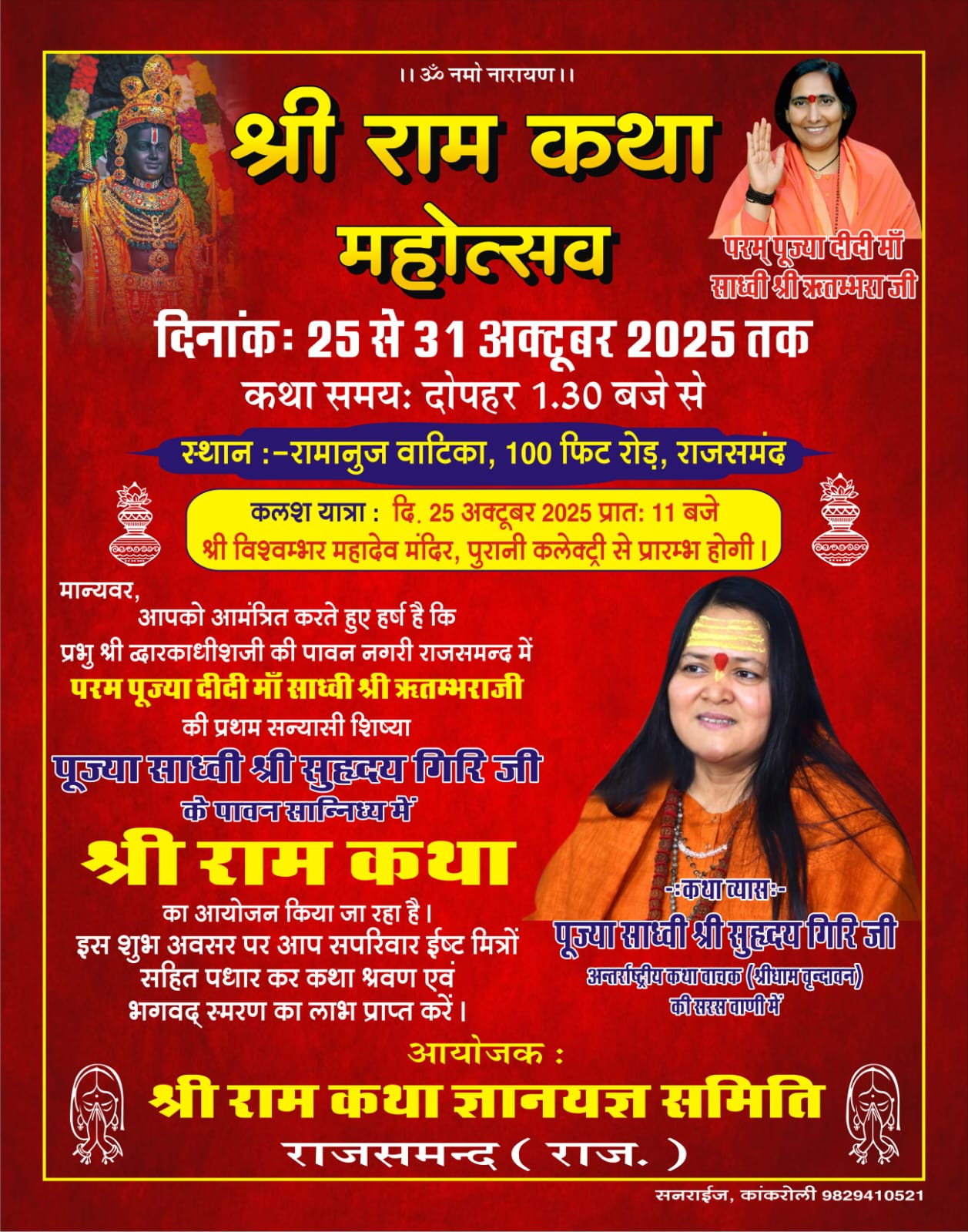 राजसमंद में 25 से 31 अक्टूबर तक होगा श्रीराम कथा महोत्सव | साध्वी सुहृदय गिरि करेंगी कथा