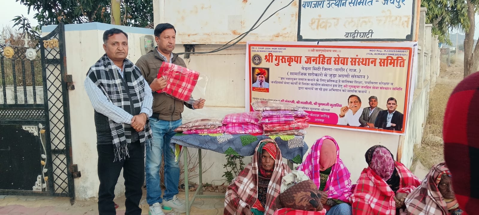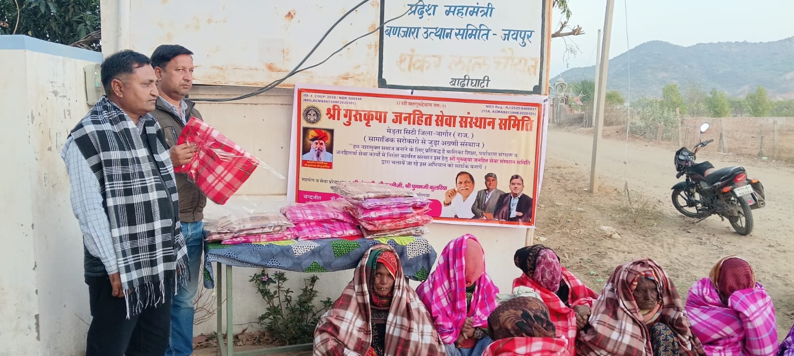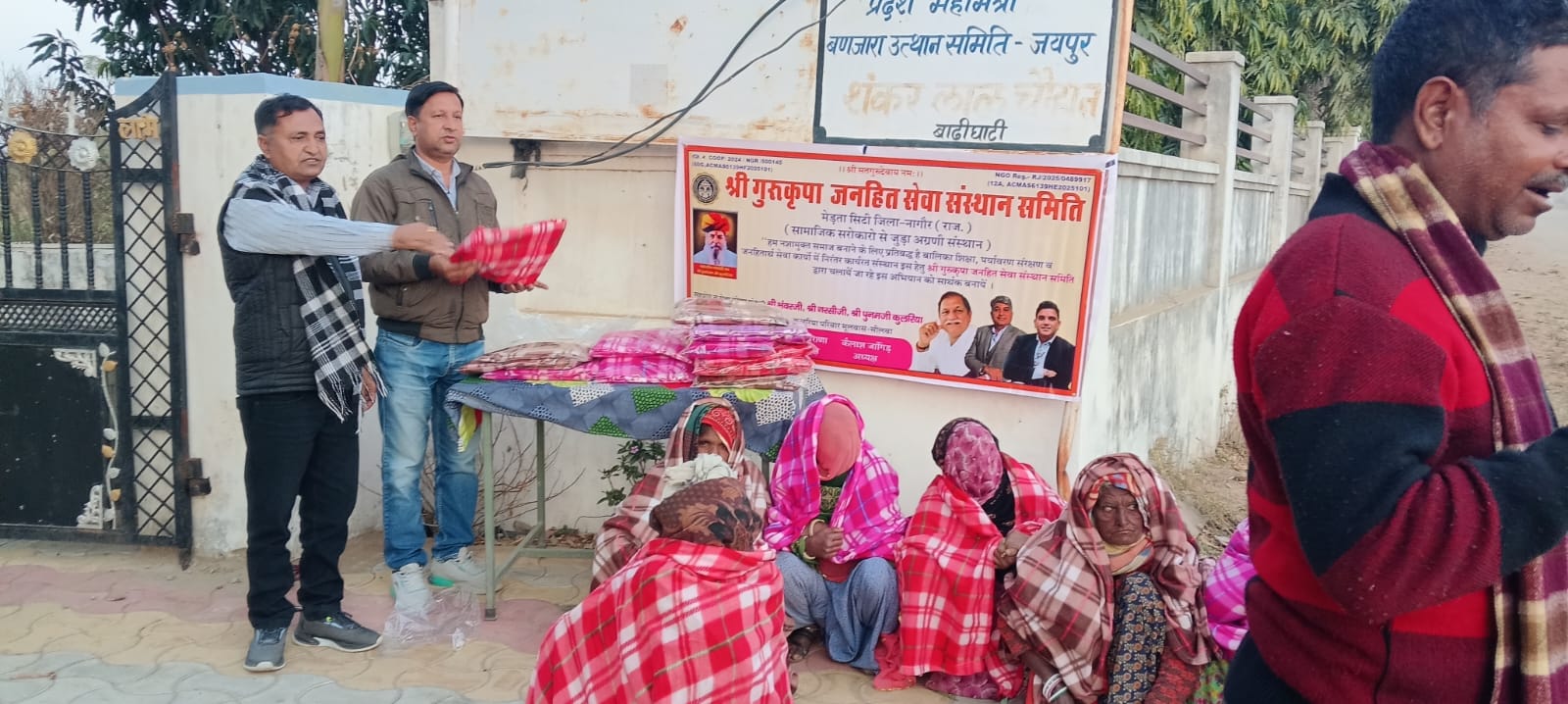 थांवला। कड़ाके की ठंड के बीच असहाय और जरूरतमंद लोगों को राहत पहुंचाने के उद्देश्य से श्री गुरु कृपा जनहित सेवा संस्थान द्वारा बाड़ीघाटी क्षेत्र में कंबल वितरण कार्यक्रम का आयोजन किया गया। यह सेवा कार्य भामाशाह नरसी कुलरिया के सहयोग से संपन्न हुआ, जिसमें अब तक पूरे मेड़ता क्षेत्र में 600 से अधिक जरूरतमंदों को गर्म कंबल वितरित किए जा चुके हैं।