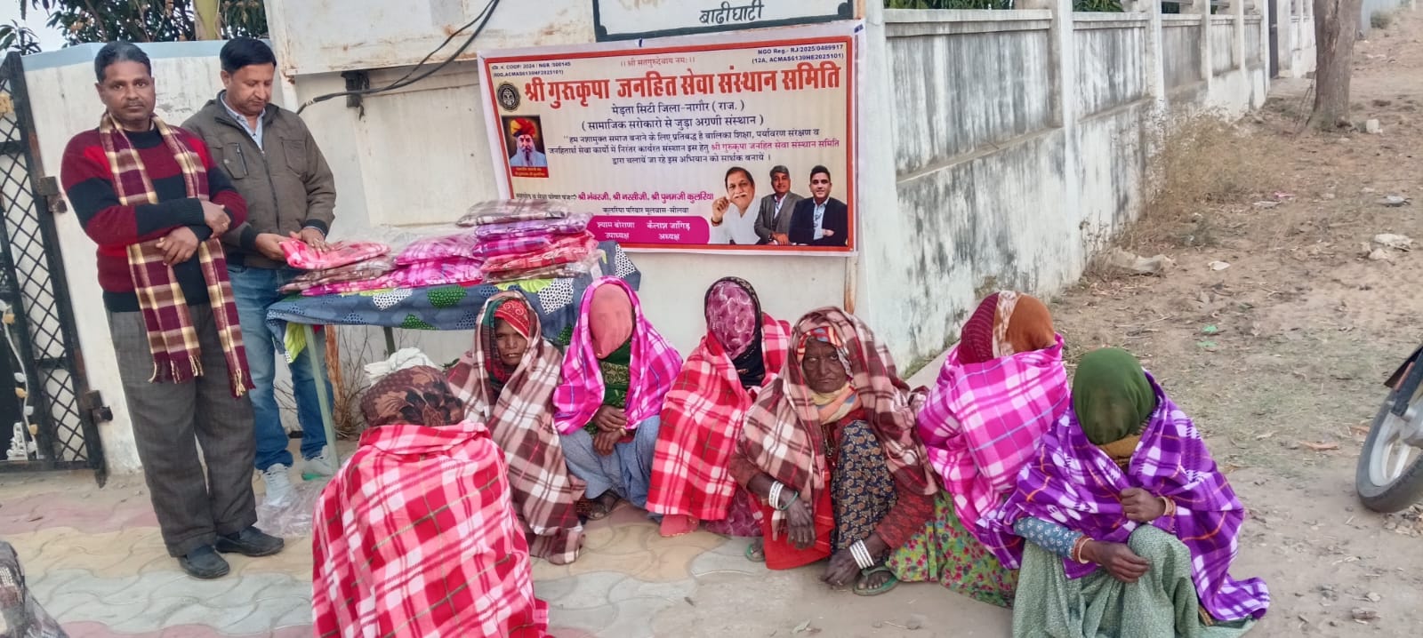कैलाश जांगिड़ ने जानकारी दी कि संस्था के कार्यकर्ता रात के समय विभिन्न क्षेत्रों में जाकर जरूरतमंदों के ठिकानों पर स्वयं पहुंचकर कंबल वितरित कर रहे हैं, ताकि कोई भी व्यक्ति ठंड में परेशान न हो। यह अभियान पूरे मेड़ता क्षेत्र में लगातार जारी है। इसी क्रम में बुधवार देर शाम थांवला के समीप बाढ़ीघाटी क्षेत्र में मजदूर वर्ग की महिलाओं को स्थानीय सरपंच शंकर बंजारा के हाथों कंबल वितरित किए गए।